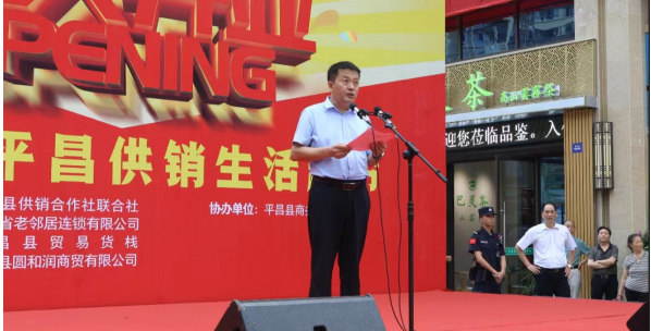 中共平昌縣縣委副書記曹光輝代表平昌縣委、縣政府致辭。他指出,省供銷社及直屬集團公司對平昌縣供銷社給予了高度重視和大力支持,2021以來,向平昌縣支持了綜合改革、農(nóng)業(yè)社會化服務、茶葉產(chǎn)業(yè)等6個項目,投入項目補助資金1311萬元,使平昌成為首個全省供銷系統(tǒng)為農(nóng)服務綜合平臺建設試點縣。他認為,“老鄰居•平昌供銷生活超市”的順利開業(yè),標志著平昌供銷為農(nóng)服務綜合平臺試點縣建設取得了重要成果,也預示著“老鄰居”品牌在平昌這片熱土上的新生,這一創(chuàng)新舉措既是強基固本、優(yōu)城興業(yè)的生動體現(xiàn),更是開放合作、守正創(chuàng)新的具體實踐。他強調(diào),“老鄰居•平昌供銷生活超市”連鎖網(wǎng)絡的問世,給平昌人民提供了大量的就業(yè)崗位,彰顯出“保供、保質(zhì)、穩(wěn)價”公有制企業(yè)特性,為平昌經(jīng)濟社會帶來了全新的物流業(yè)態(tài)和消費時尚。他表示,要以省市供銷社對平昌縣的重視和關懷為契機,以《四川省供銷合作社條例》為準則,以“兩個加快”為抓手,主動擔當作為,全面推進供銷合作社綜合改革,奮力推動供銷合作事業(yè)高質(zhì)量發(fā)展。