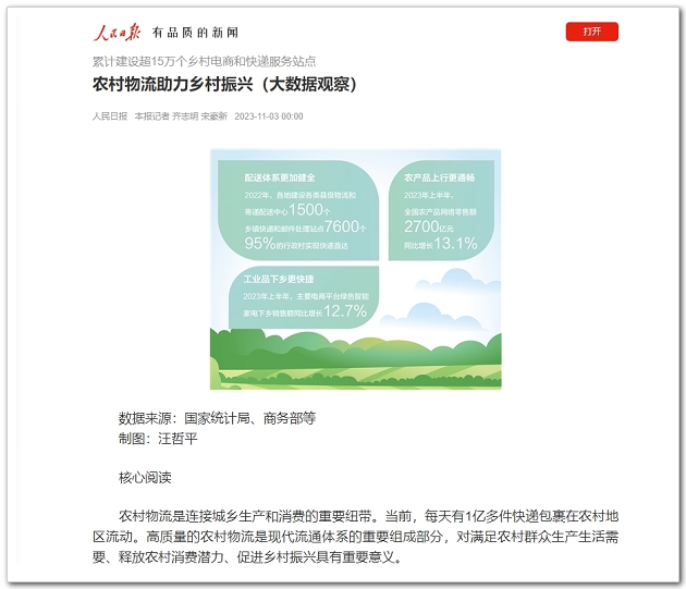 農(nóng)村物流是連接城鄉(xiāng)生產(chǎn)和消費的重要紐帶。當(dāng)前,每天有1億多件快遞包裹在農(nóng)村地區(qū)流動。高質(zhì)量的農(nóng)村物流是現(xiàn)代流通體系的重要組成部分,對滿足農(nóng)村群眾生產(chǎn)生活需要、釋放農(nóng)村消費潛力、促進(jìn)鄉(xiāng)村振興具有重要意義。