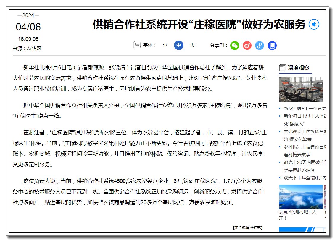 據(jù)中華全國供銷合作總社相關(guān)負(fù)責(zé)人介紹,全國供銷合作社系統(tǒng)已開設(shè)6萬多家“莊稼醫(yī)院”,派出7萬多名“莊稼醫(yī)生”蹲點一線。
