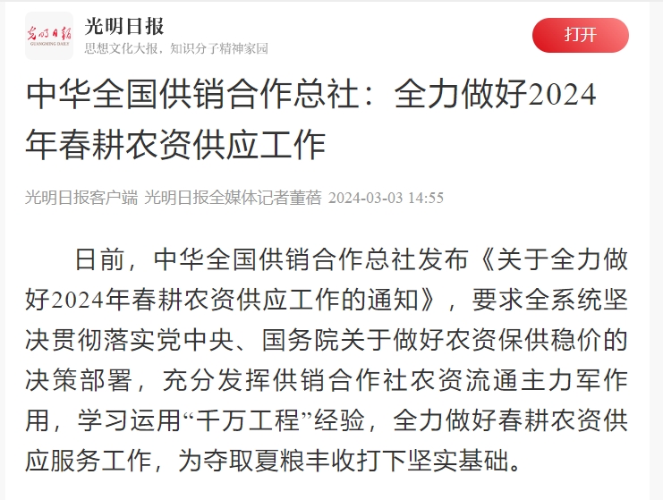 日前,中華全國(guó)供銷合作總社發(fā)布《關(guān)于全力做好2024年春耕農(nóng)資供應(yīng)工作的通知》,要求全系統(tǒng)堅(jiān)決貫徹落實(shí)黨中央、國(guó)務(wù)院關(guān)于做好農(nóng)資保供穩(wěn)價(jià)的決策部署,充分發(fā)揮供銷合作社農(nóng)資流通主力軍作用,學(xué)習(xí)運(yùn)用“千萬(wàn)工程”經(jīng)驗(yàn),全力做好春耕農(nóng)資供應(yīng)服務(wù)工作,為奪取夏糧豐收打下堅(jiān)實(shí)基礎(chǔ)。