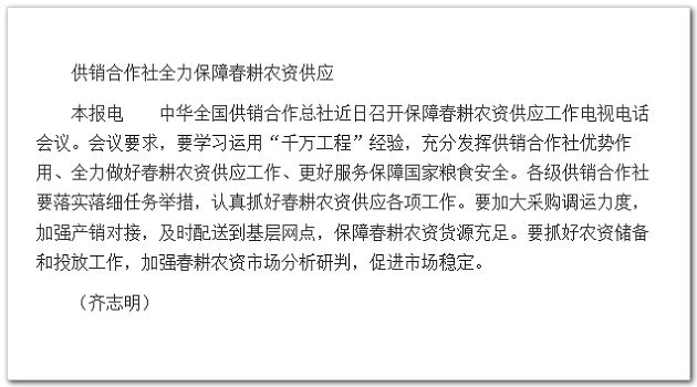 中華全國供銷合作總社近日召開保障春耕農(nóng)資供應(yīng)工作電視電話會議。會議要求,要學(xué)習(xí)運用“千萬工程”經(jīng)驗,充分發(fā)揮供銷合作社優(yōu)勢作用、全力做好春耕農(nóng)資供應(yīng)工作、更好服務(wù)保障國家糧食安全。各級供銷合作社要落實落細(xì)任務(wù)舉措,認(rèn)真抓好春耕農(nóng)資供應(yīng)各項工作。要加大采購調(diào)運力度,加強(qiáng)產(chǎn)銷對接,及時配送到基層網(wǎng)點,保障春耕農(nóng)資貨源充足。要抓好農(nóng)資儲備和投放工作,加強(qiáng)春耕農(nóng)資市場分析研判,促進(jìn)市場穩(wěn)定。