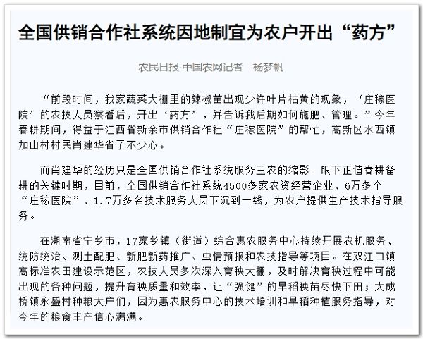而肖建華的經(jīng)歷只是全國供銷合作社系統(tǒng)服務(wù)三農(nóng)的縮影。眼下正值春耕備耕的關(guān)鍵時期,目前,全國供銷合作社系統(tǒng)4500多家農(nóng)資經(jīng)營企業(yè)、6萬多個“莊稼醫(yī)院”、1.7萬多名技術(shù)服務(wù)人員下沉到一線,為農(nóng)戶提供生產(chǎn)技術(shù)指導(dǎo)服務(wù)。